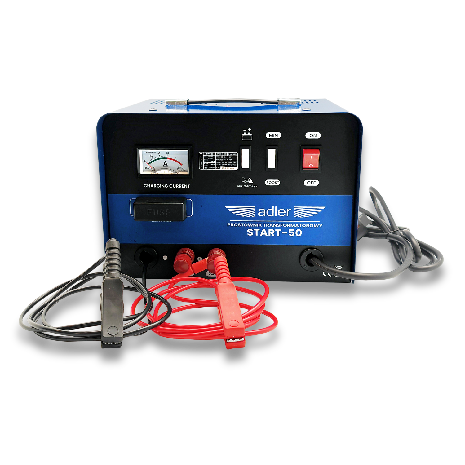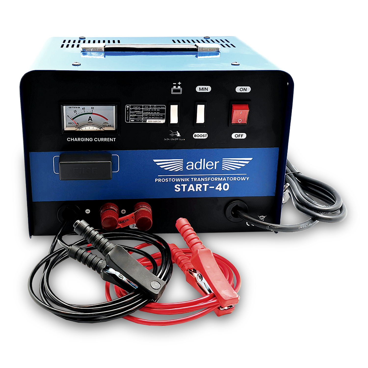Transformatorowy prostownik Adler START-1025 to urządzenie do ładowania akumulatorów kwasowo – ołowiowych. Zasilanie napięciem 400V zapewnia bardzo wysoki prąd ładowania i rozruchu. Prostownik jest prosty w obsłudze i niezawodny nawet w najtrudniejszych warunkach. Obudowa urządzenia wykonana jest zgodnie z normą PN-EN 60529:2003 i spełnia klasę ochrony IP20. Koła jezdne ułatwiają przemieszczanie urządzenia.